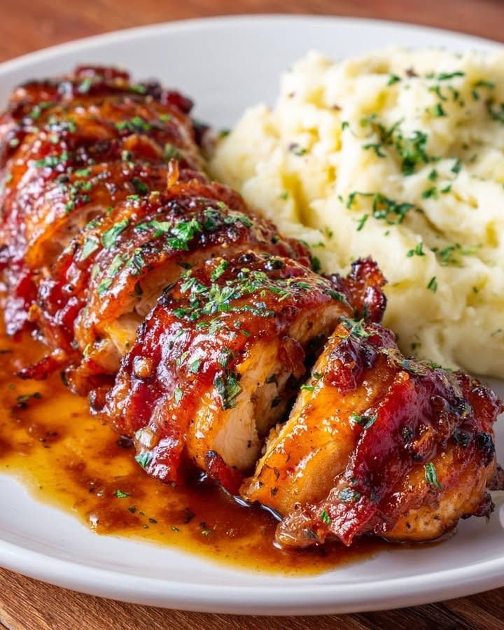 Bake for 25–30 minutes, or until the bacon is crispy and the chicken is fully cooked.