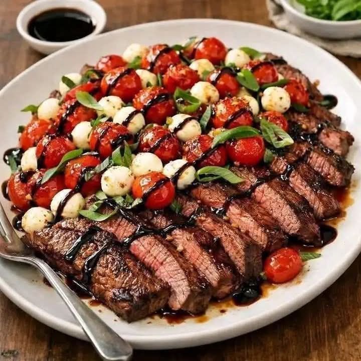Balsamic-Marinated Flank Steak with Blistered Tomatoes, Mozzarella & Basil is a stunning dish that combines bold flavors with fresh, simple ingredients. It’s easy enough for a weeknight meal yet elegant enough for entertaining.