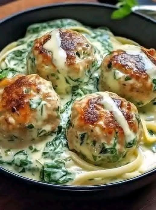 This dish is rich in protein thanks to the chicken meatballs, while the spinach adds vitamins and minerals like iron and vitamin A. The cream sauce contributes richness, so portion control can help balance the meal.