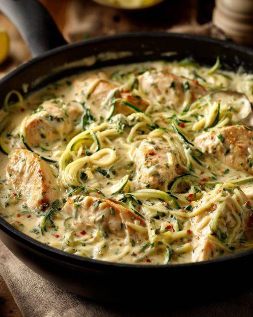 Creamy Chicken Alfredo with Zucchini Noodles is a lighter, low-carb twist on the classic Italian pasta dish. Instead of traditional fettuccine, this recipe uses spiralized zucchini—often called zoodles—to create a fresh and nutritious base for a rich Alfredo sauce. Paired with tender chicken and a creamy garlic Parmesan sauce, this dish delivers all the comforting flavor of classic Alfredo while being healthier and lighter.