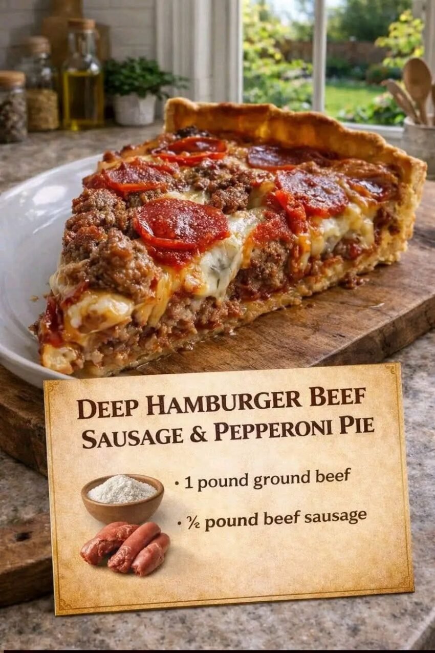 Deep Hamburger Beef Sausage and Pepperoni Pie is a bold, indulgent dish that brings together the best of pizza and pie in one satisfying meal. With its rich layers of meat, gooey cheese, and flaky crust, it’s guaranteed to be a hit at the table.
