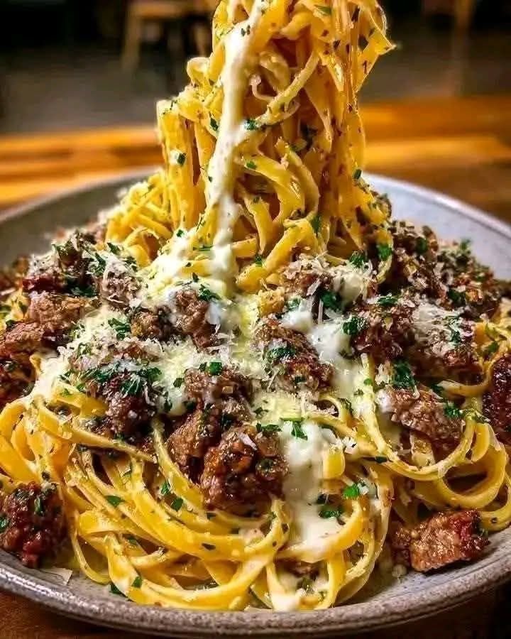 This pasta dish delivers everything you want in comfort food—savory beef, creamy sauce, and perfectly cooked pasta. The garlic butter enhances the richness of the beef, while the Parmesan cream sauce adds a smooth, velvety finish.