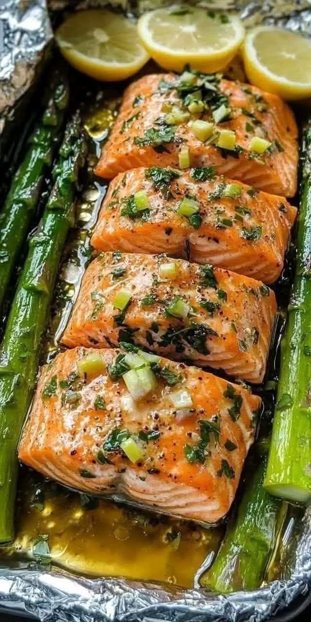 With tender salmon, crisp asparagus, and a rich garlic butter sauce, this dish offers a perfect balance of nutrition, flavor, and ease. Serve with lemon and fresh herbs for an elegant presentation and enjoy a wholesome, gourmet-style dinner at home.