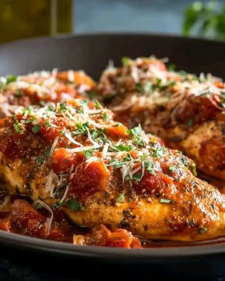 Pour the tomato mixture evenly over the chicken breasts. Add optional vegetables such as bell peppers or mushrooms if desired.
