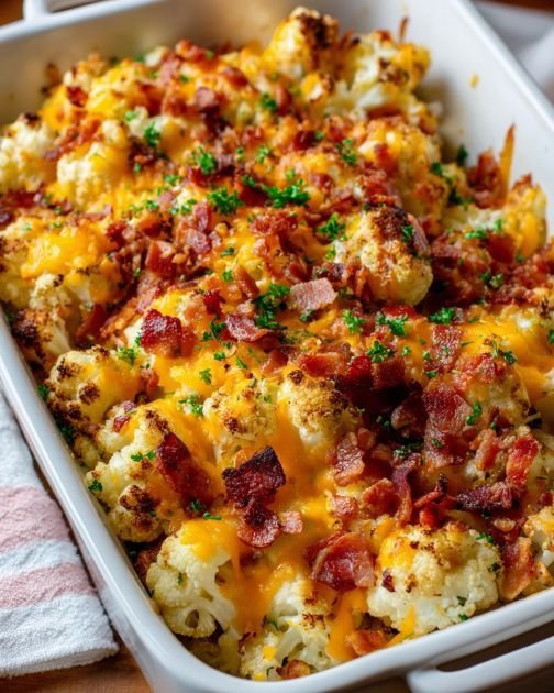 Loaded Cauliflower Casserole is a rich, satisfying dish that transforms simple cauliflower into a creamy, cheesy, flavor-packed comfort food. Inspired by loaded baked potatoes, this casserole features tender cauliflower tossed in a creamy sauce, topped with melted cheese, crispy bacon, and fresh green onions.