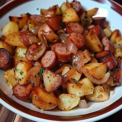 Serve the dish hot and enjoy the delicious combination of crispy potatoes, sweet onions, and smoky sausage.