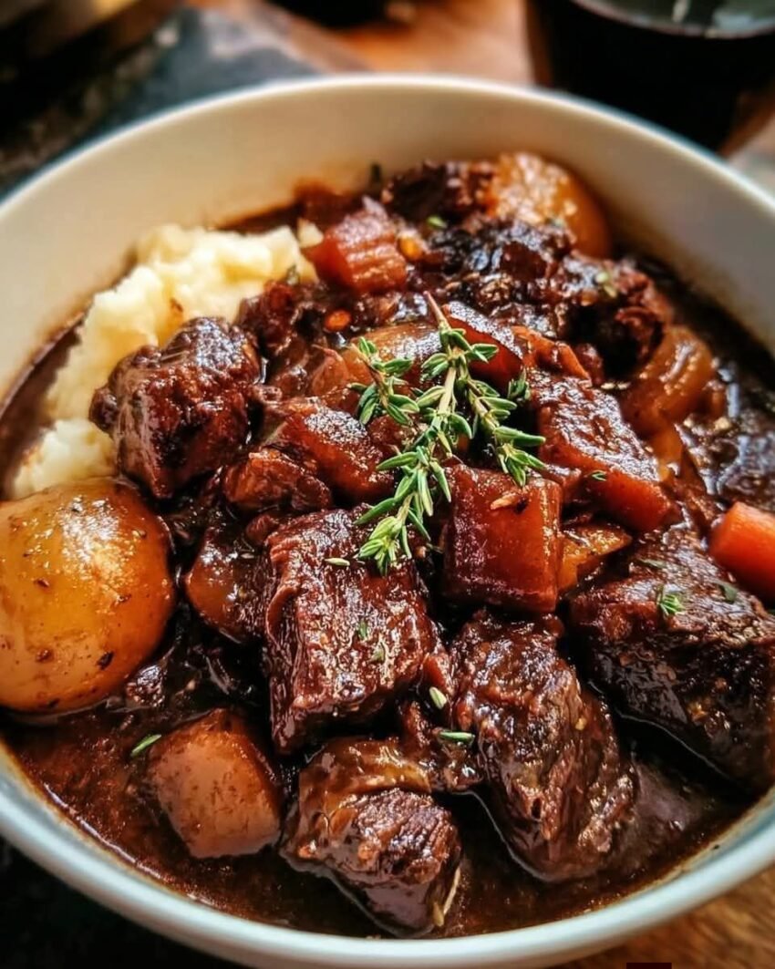 Rustic Burgundy-Style Slow-Braised Beef in Rich Red Wine Sauce is the ultimate comfort dish, combining tender meat, rich sauce, and deep, satisfying flavors. Inspired by Boeuf Bourguignon, it’s a timeless recipe that transforms simple ingredients into something truly special.