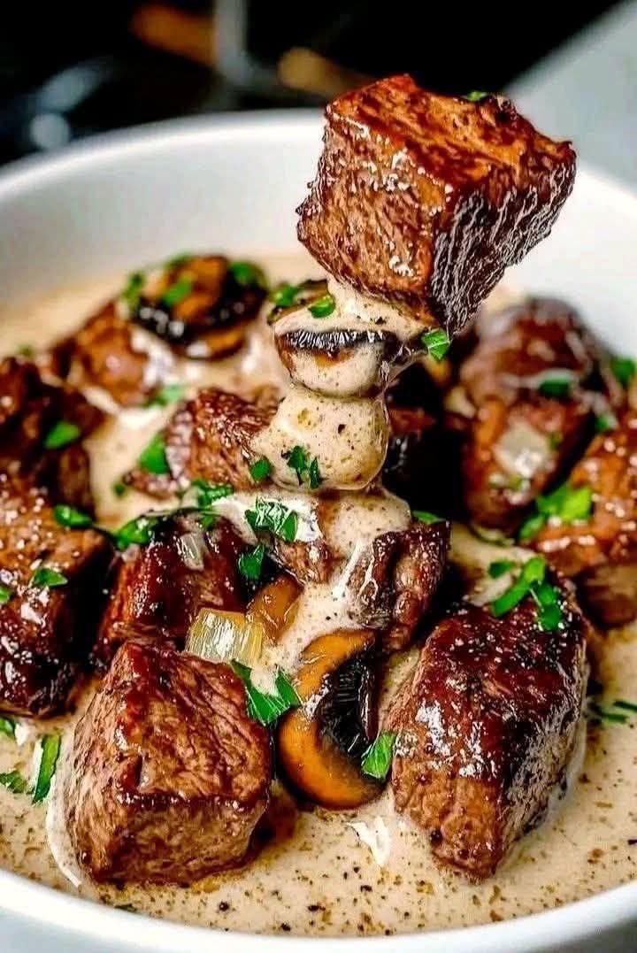 Steak Bites with Creamy Mushroom Sauce is a decadent, easy-to-make dish that transforms a simple cut of meat into a luxurious meal. The tender steak, earthy mushrooms, and velvety cream sauce make every bite satisfying and flavorful.