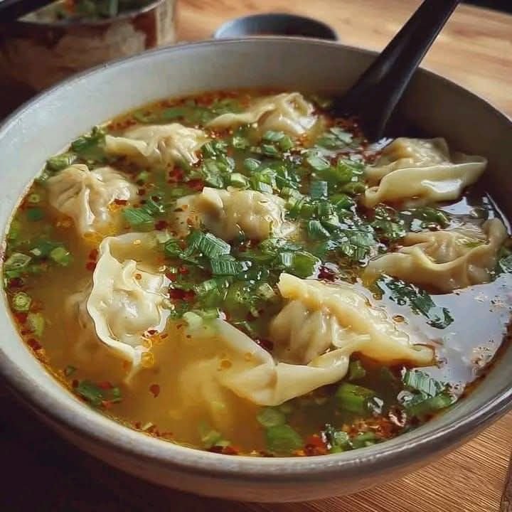 Wonton Soup is a comforting and flavorful dish from Chinese cuisine featuring delicate dumplings filled with seasoned meat, served in a light and aromatic broth. The soft wontons, savory filling, and warm broth create a simple yet satisfying soup that is perfect for lunch, dinner, or a cozy starter.